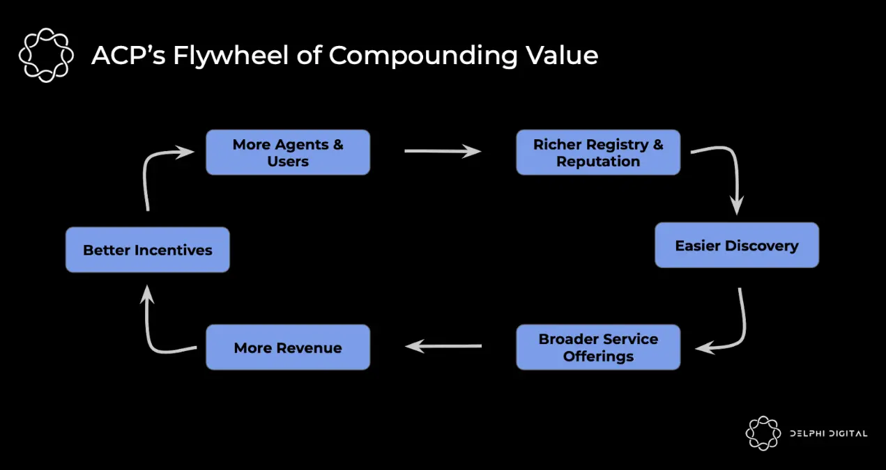 المعيار المفتوح لتنسيق ACP قادر على خلق تأثيرات شبكة أقوى وأكثر استدامة من الأنظمة البيئية المنعزلة. كل وكيل أو مطوّر أو مستخدم جديد يثري سوق ACP ومركز التسجيل، ويعمق بيانات السمعة والسيولة وأنواع الخدمات المقدمة لجميع أصحاب المصلحة. هذا يخلق حلقة قيمة متراكمة في النظام البيئي: