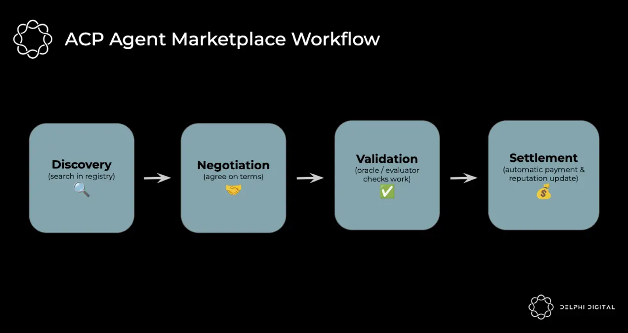 لكن على عكس Fiverr، حيث يتم التحكم في الترتيب وهيكل الرسوم وحل النزاعات من قبل المنصة، يقوم ACP بترميز كل قائمة وعقد وتقييم داخل السلسلة. شروط الخدمة، المواعيد النهائية، وتقسيم العائدات كلها قابلة للبرمجة وشفافة. يتم التحقق من قبل وكلاء تقييم موضوعيين، ويتم تسوية المدفوعات تلقائياً عبر العقود الذكية، وليس من خلال شركة مركزية.