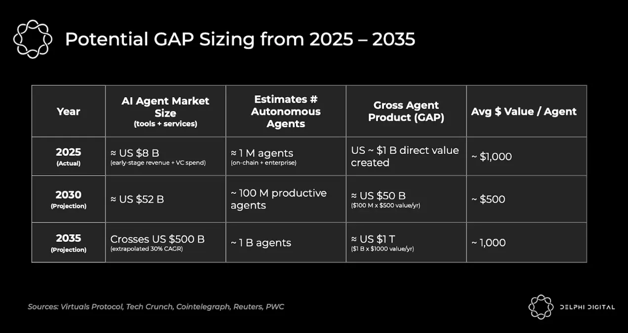لفهم الإمكانات الاقتصادية الناشئة لاقتصاد الوكلاء، من الأفضل النظر إلى إجمالي قيمة إنتاج الوكلاء (GAP). GAP هو مصطلح قدمه فريق Virtuals، ويمثل إجمالي القيمة التي يخلقها الوكلاء المستقلون في الشبكة.