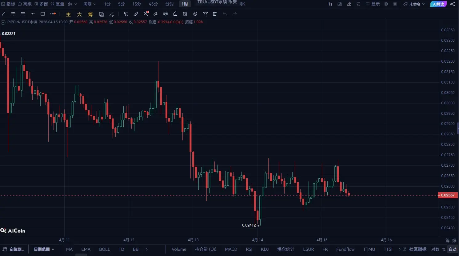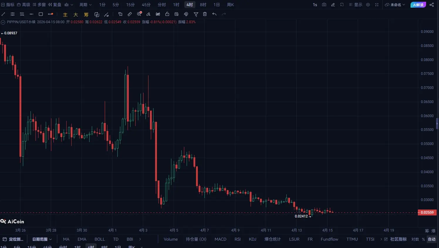 من هيكل المستوى اليومي، فإن PIPPIN في اتجاه هبوطي واضح، حيث تتراجع القمم باستمرار، من منطقة 0.033 وتذبذب بشكل ضعيف، والآن السعر قد تراجع إلى حوالي 0.025.