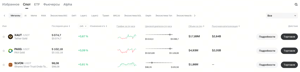• Couvre les principaux métaux précieux mondiaux. Prend actuellement en charge le trading spot de tokens pour l’or et l’argent, y compris XAUT/USDT, PAXG/USDT, SLVON/USDT, et plus encore.