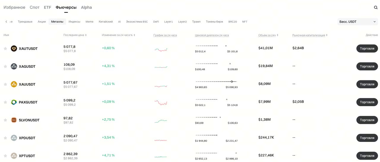 • Couvre les principaux dérivés sur métaux précieux mondiaux. Prend actuellement en charge les contrats perpétuels USDT pour l’or, l’argent, le platine et le palladium, y compris XAUT/USDT, PAXG/USDT, SLVON/USDT, XAG/USDT, XAU/USDT, XPD/USDT, XPT/USDT, et plus encore.