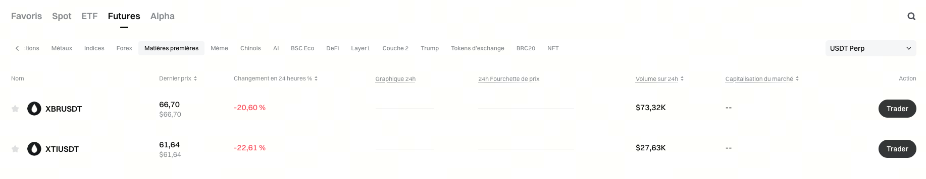 Lancement des nouveaux contrats futures XTI et XBR, offrant un effet de levier pouvant atteindre 100x. Les utilisateurs peuvent accéder à la page du Marché des Futures et sélectionner la catégorie Matières Premières pour consulter les paires de trading disponibles.