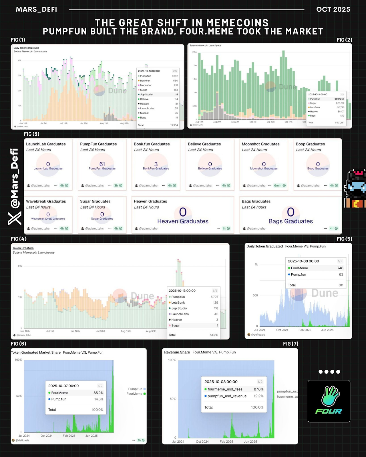 Pendant longtemps, pump(.)fun a incarné le moteur des memecoins. Pourtant, cette réputation n’est que partiellement justifiée. PumpFun domine certes, mais uniquement sur Solana. En élargissant la perspective, BSC (via @ fourmeme) est en train de s’imposer discrètement sur l’ensemble du secteur. D’après les données de l’infographie (état du marché sur les dernières 24 heures) : • PumpFun lance près de 11 000 tokens par jour, soit plus que l’ensemble des autres launchpads Solana réunis. (1) • Les revenus quotidiens atteignent fréquemment 500 000 $ à 600 000 $, faisant de la plateforme Sol la plus rentable. (2) • 61 projets diplômés en 24 heures, alors que Boop, Bags, Believe, LaunchLabs, Heaven, etc. enregistrent entre 0 et 3. (3) • Les autres launchpads Sol tels que LetsBonk, Sugar, Moonshot, Jup Studio, Launchlabs peinent à attirer les créateurs de tokens (4). Conclusion : Solana est devenue le terrain d’un seul acteur. Trader des memecoins Solana revient à trader des memecoins PumpFun, ou à ne rien trader du tout. Le véritable changement s’observe sur la comparaison cross-chain (pump(.)fun pour SOL vs @ fourmeme pour BSC) • Projets diplômés (jour type) : 63 contre 748 (5) • Part de marché (tokens diplômés) : 14,8 % contre 85,2 % (6) • Part des revenus (frais quotidiens) : 12,2 % contre 87,8 % (7) Certains jours, @ fourmeme représente 85 à 90 % de tous les memecoins performants lancés sur les deux blockchains. Ce seul constat révèle clairement où se concentre désormais la liquidité. Pour réussir en trading, il est essentiel de comprendre que la liquidité prime toujours sur la fidélité à une marque. Les traders doivent en tenir compte. À se demander : • Êtes-vous fidèle à une blockchain ou à la performance ? • Tradez-vous des tokens ou des flux de liquidité ? • Si plus de 80 % des memecoins gagnants sont sur BSC, n’est-ce pas là que vous devez être ? La réalité ? Si vous ne pouvez pas pivoter cross-chain, vous n’êtes pas un trader mais un spectateur. Cadre d’action pour la suite (comment se positionner) Pour les chasseurs de memecoins : • Suivez l’émergence du capital, pas seulement sa destination. • @ fourmeme est actuellement la zone de référence “Zero to One”. • pump(.)fun reste pertinent, mais à considérer comme un pool secondaire et non comme choix principal. Pour les créateurs : • Pour une liquidité véritablement organique, privilégiez un lancement initial sur @ fourmeme Pour les investisseurs / observateurs : • Ce phénomène illustre la maturité du marché : • Solana incarne la culture et l’innovation. • BSC devient le nouveau terrain de l’exécution et du volume. De plus, un Reload Airdrop de 45 M$ a récemment été annoncé par @ fourmeme, en partenariat avec l’écosystème. À retenir : • Plus de 160 000 utilisateurs ayant tradé des memecoins la semaine passée et subi des pertes seront éligibles. Les tokens $BNB seront distribués de manière aléatoire sur ces adresses. • L’objectif est une initiative d’envergure pour restaurer la confiance et récompenser la résilience de la communauté. La première distribution débute cette semaine et l’ensemble des airdrops sera finalisé d’ici début novembre 2025. Ce constat suffit à indiquer où se concentrera la liquidité dans les prochaines semaines, il convient donc d’ajuster votre positionnement.