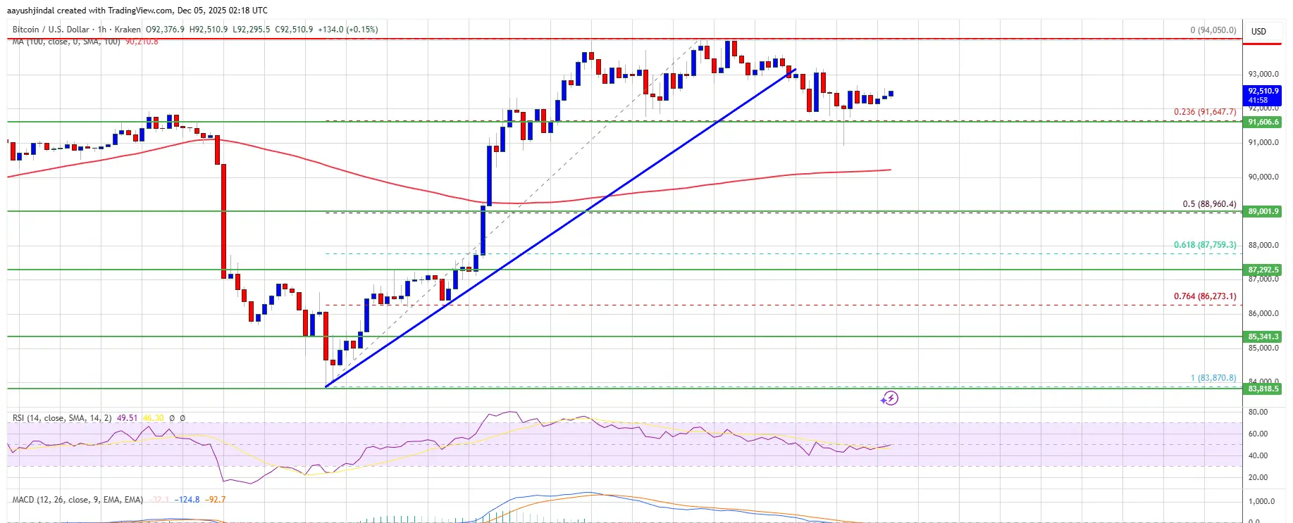 Terjadi penembusan di bawah garis tren bullish dengan support di $93,000 pada grafik per jam pasangan BTC/USD. Bitcoin sekarang diperdagangkan di atas $92,000 dan Simple Moving Average 100 per jam.