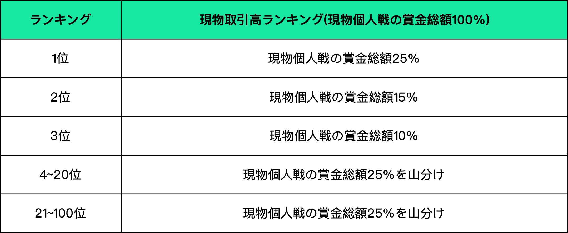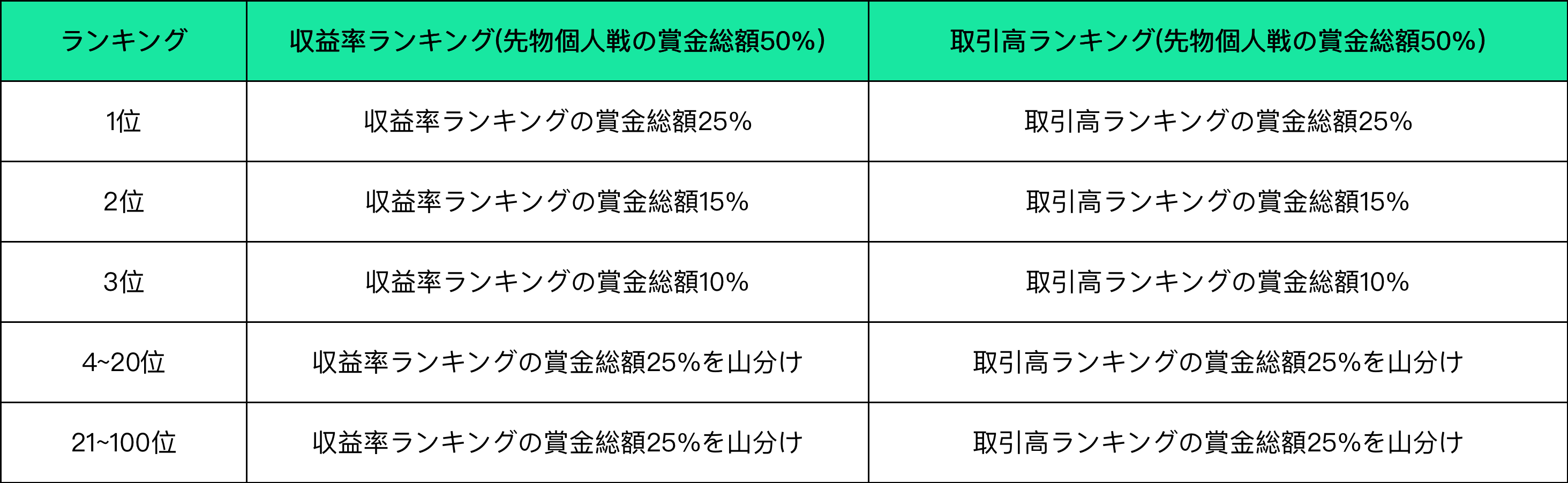 各部門において、先物個人戦に参加したユーザーは、それぞれ収益率と取引高によってランク付けされます。その中で、収益率でランク付けされたユーザーが先物個人戦の賞金プールの50%を占め、取引高でランク付けされたユーザーが残りの50%を占めます。