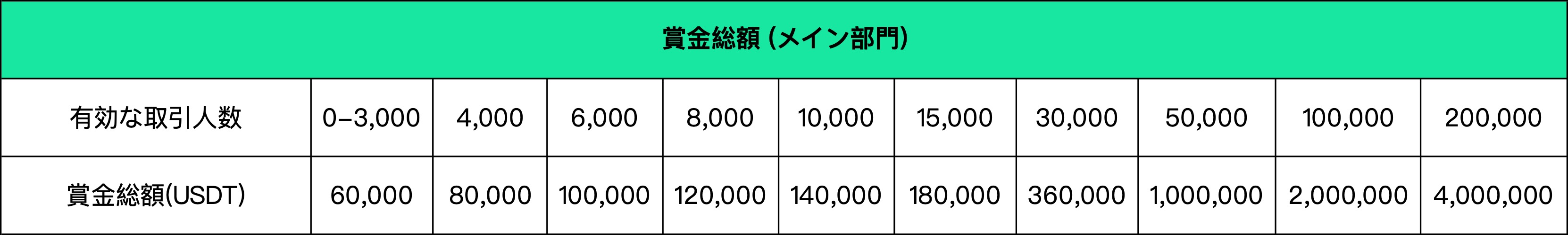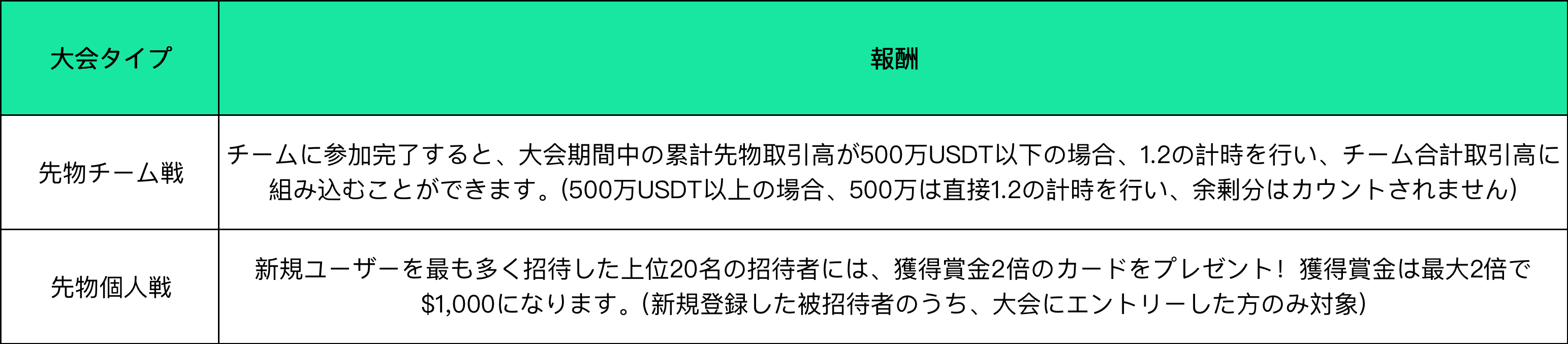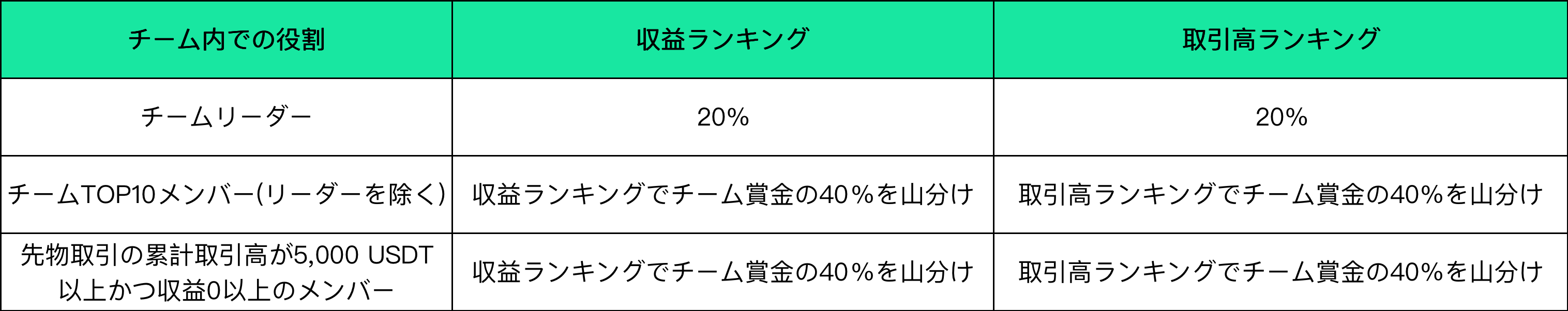 2.チーム取引高=チーム内の取引高の合計。大会期間中の累計取引高が5,000USDT未満のユーザーはランク付けされません。