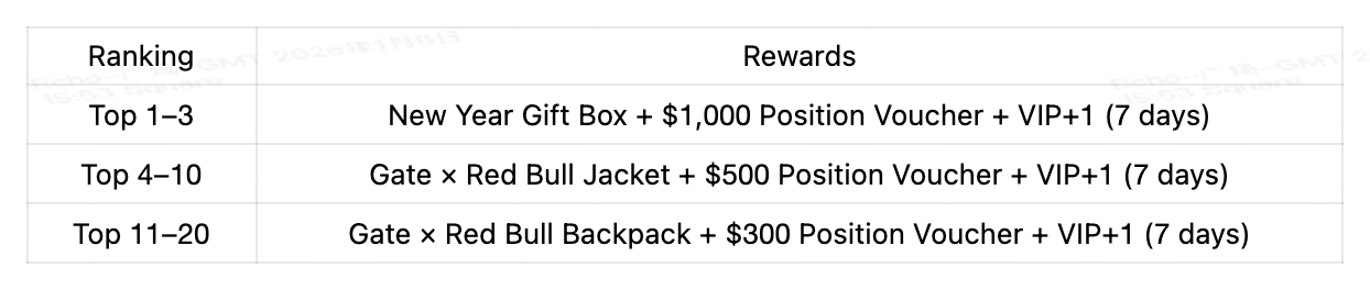 - 物理報酬はイベント終了後14営業日以内にメールおよびサイト内メッセージで通知します。受賞者はGate Shopで30日以内に配送情報を提出してください。期限後の提出、誤記、配送失敗は辞退扱いとなります。情報提出後60日以内に発送します。配送不可の場合は先物クーポンで代替します(例:新年ギフトボックス→500ポジションクーポン、Gate × Red Bullジャケット→300ドル分ポジションクーポン、Gate × Red Bullキャップ→200ドル分ポジションクーポン)。