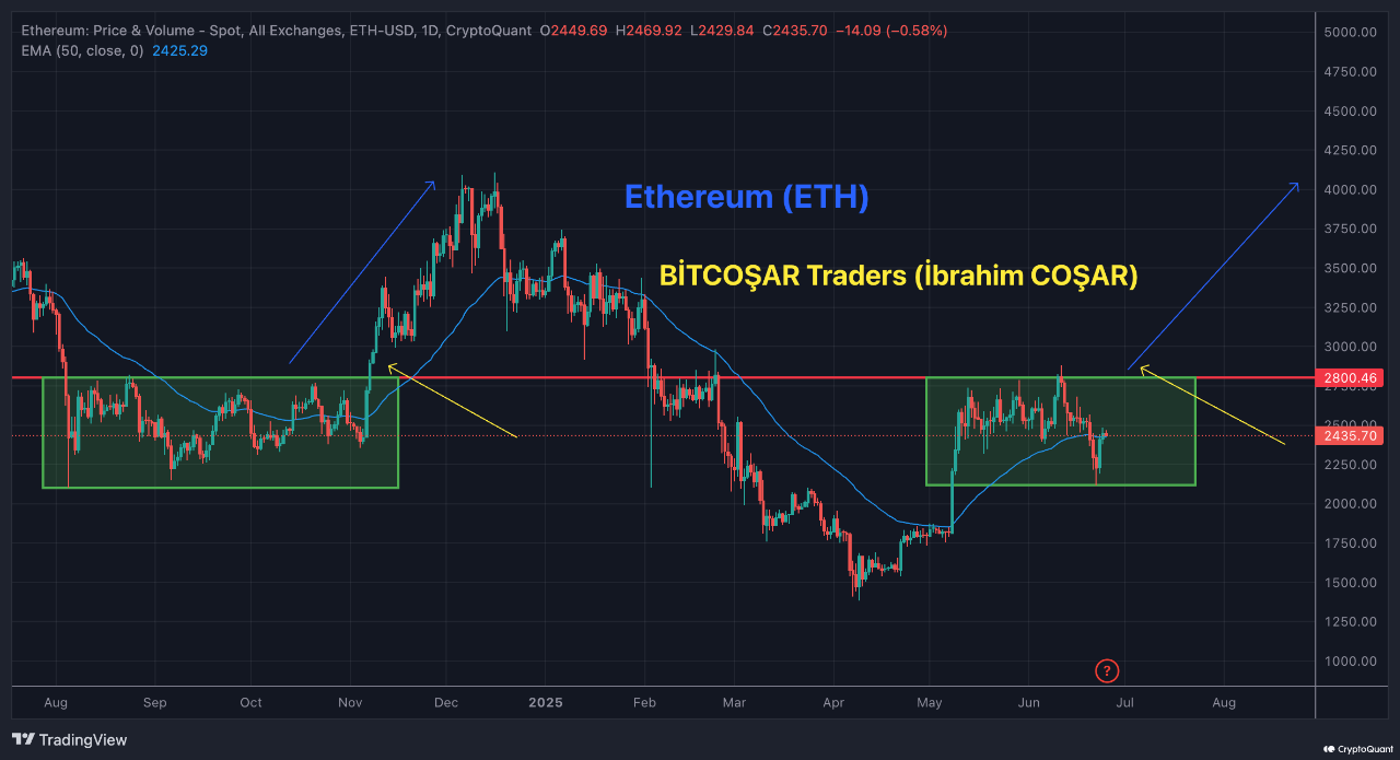 İbrahim COŞARは彼の分析の中で、イーサリアムは2500-2600ドルの範囲を上回って持続的に推移する必要があると強調しています。過去のデータは、ETHが類似の整理区域を突破した後に大幅な変動を示したことを示しています。