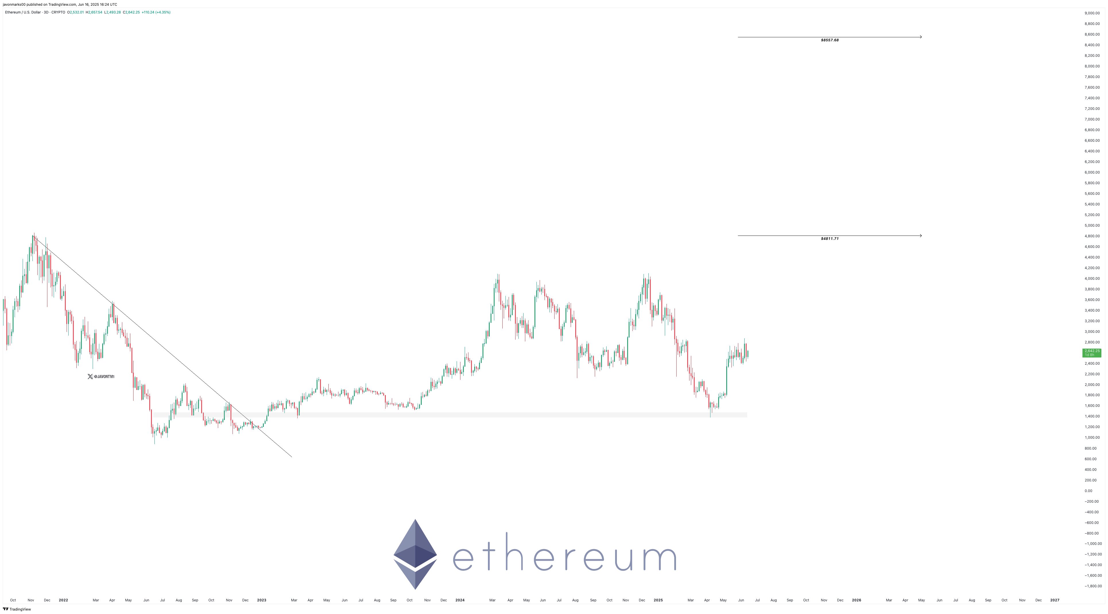 彼はイーサリアムが81%上昇し、4811.71ドルの目標価格に達する可能性があると予測しています。さらに、勢いが強まれば、さらなる上昇が77%まで拡大し、価格が8557.68ドルに達する可能性があります。