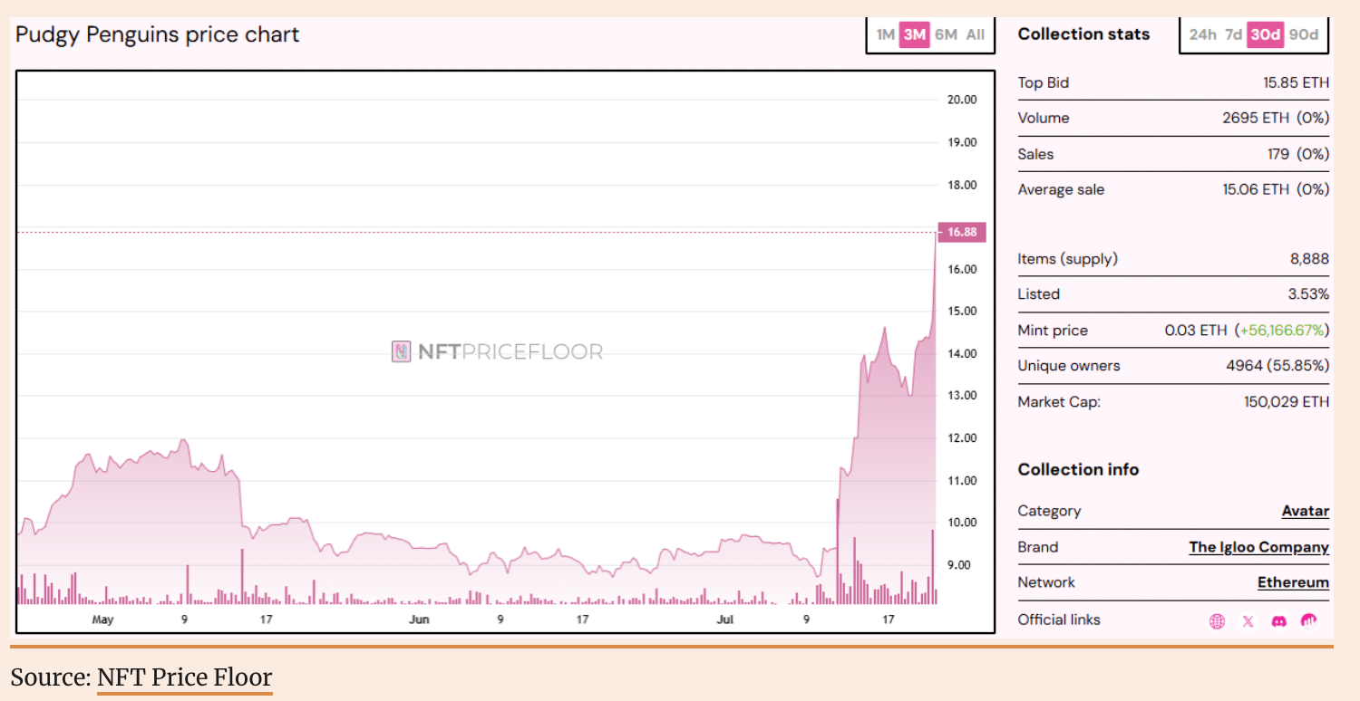 この背景の中で、Pudgy Penguinsのフロア価格も顕著に上昇し、$10未満から$16.88まで上昇し、わずか2週間足らずで達成しました。