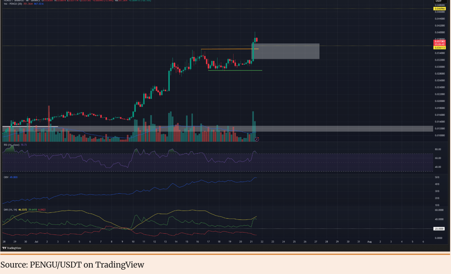 ! Pudgy Penguinsは1日チャートで強い上昇モメンタムを示しており、特に6月28日に市場構造を突破した後です。過去1週間で上昇モメンタムが鈍化しているものの、RSI(相対力指数)は87から75に低下しましたが、PENGUの価格は依然として$0.03から$0.035の間を維持しており、7月21日に$0.0361の重要な抵抗線を突破し、新しい高値を記録しました。