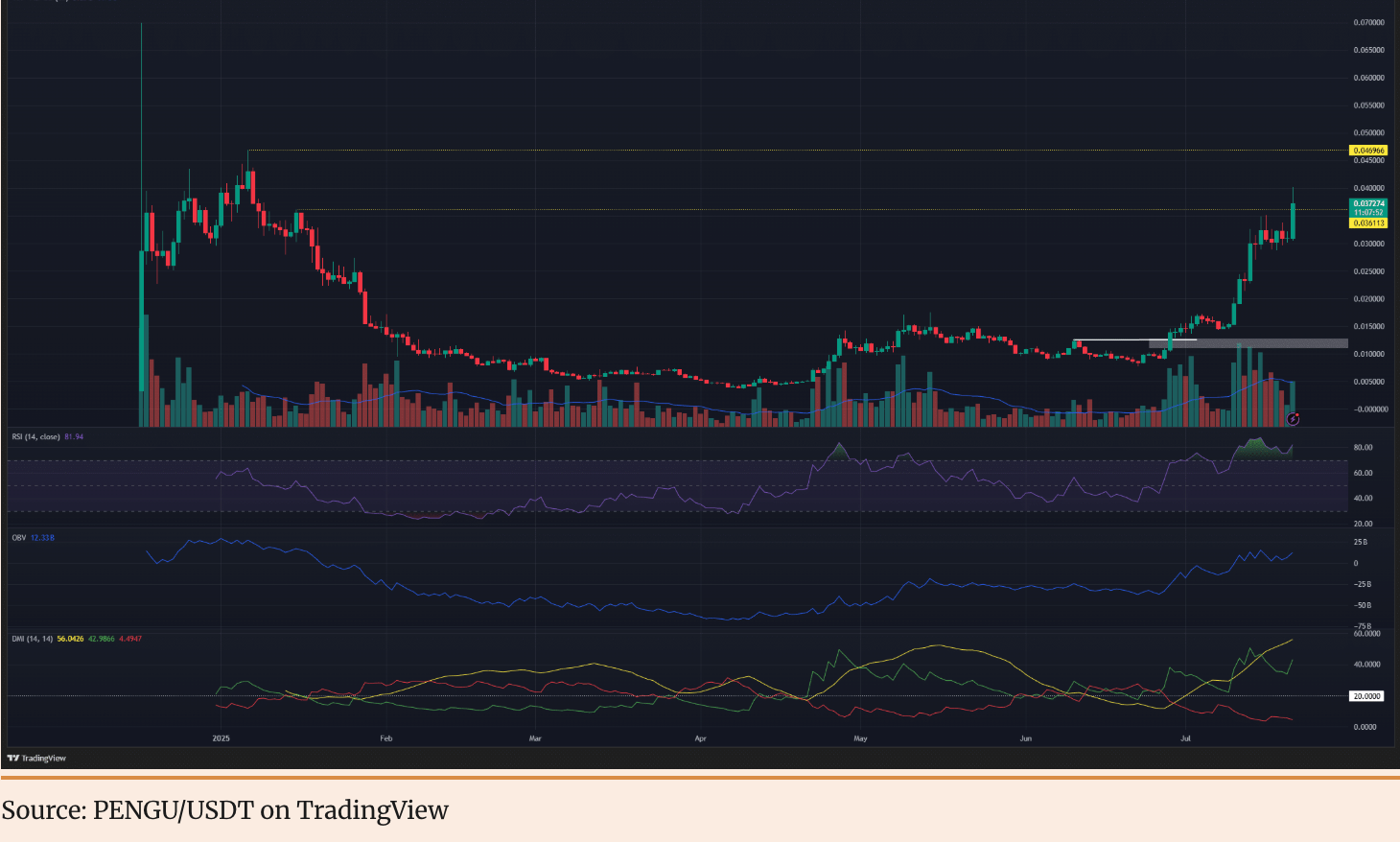 Pudgy Penguins(PENGU)価格予測:テクニカル指標がポンプの潜在能力を示しており、目標価格は$0.047です。