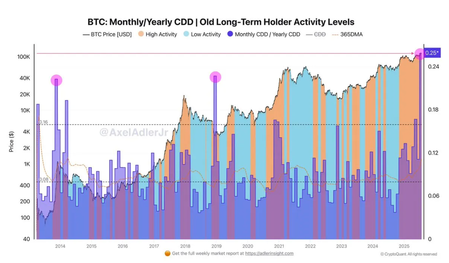 市場配分信号:長期保有者の行動変化 トップアナリストのAxel Adlerは、ビットコイン市場の行動の重要な転換点は、月次CDDと年次CDDの比率の急激な上昇にあり、長期保有者(LTHs)が眠っていたビットコインを再び市場に投入し始めたことを示していると指摘しています。歴史的に、CDD値が上昇する時期は通常、経験豊富な投資家の活発な行動を伴い、しばしば長期保有の後に利益を確定し始める配分段階を意味します。