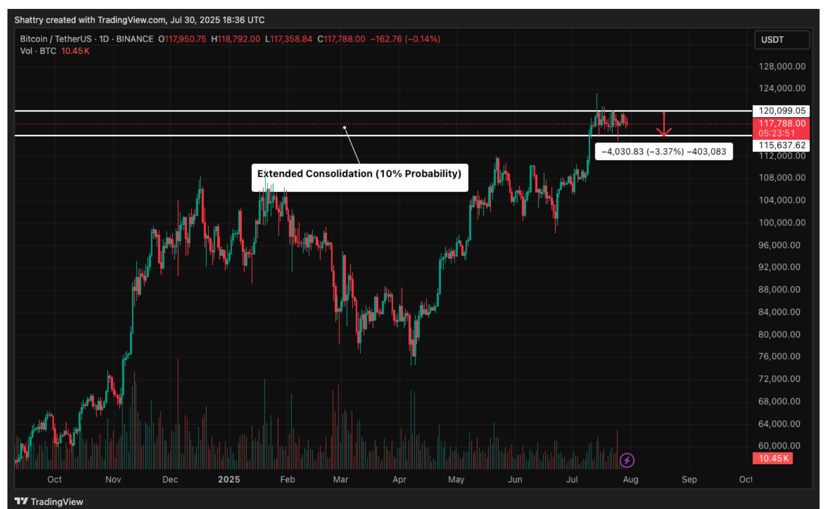 ベースケースシナリオ(確率65%):10-14日以内に118,500ドルを突破し、30日目に120,000-122,000ドルに向かい、45日目に整理し再テストを行い、その後75-90日目に125,000-130,000ドルに向かって加速します。