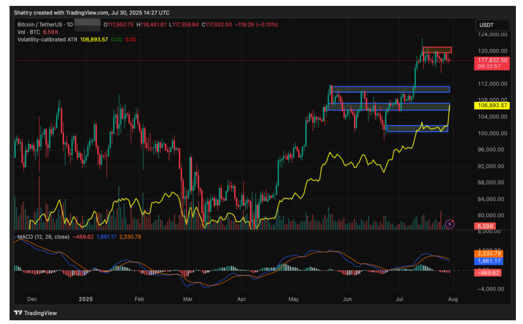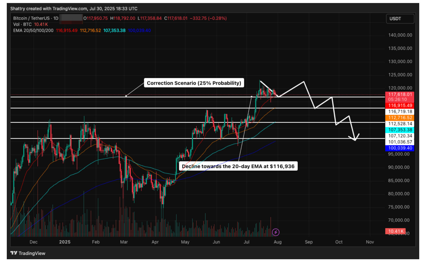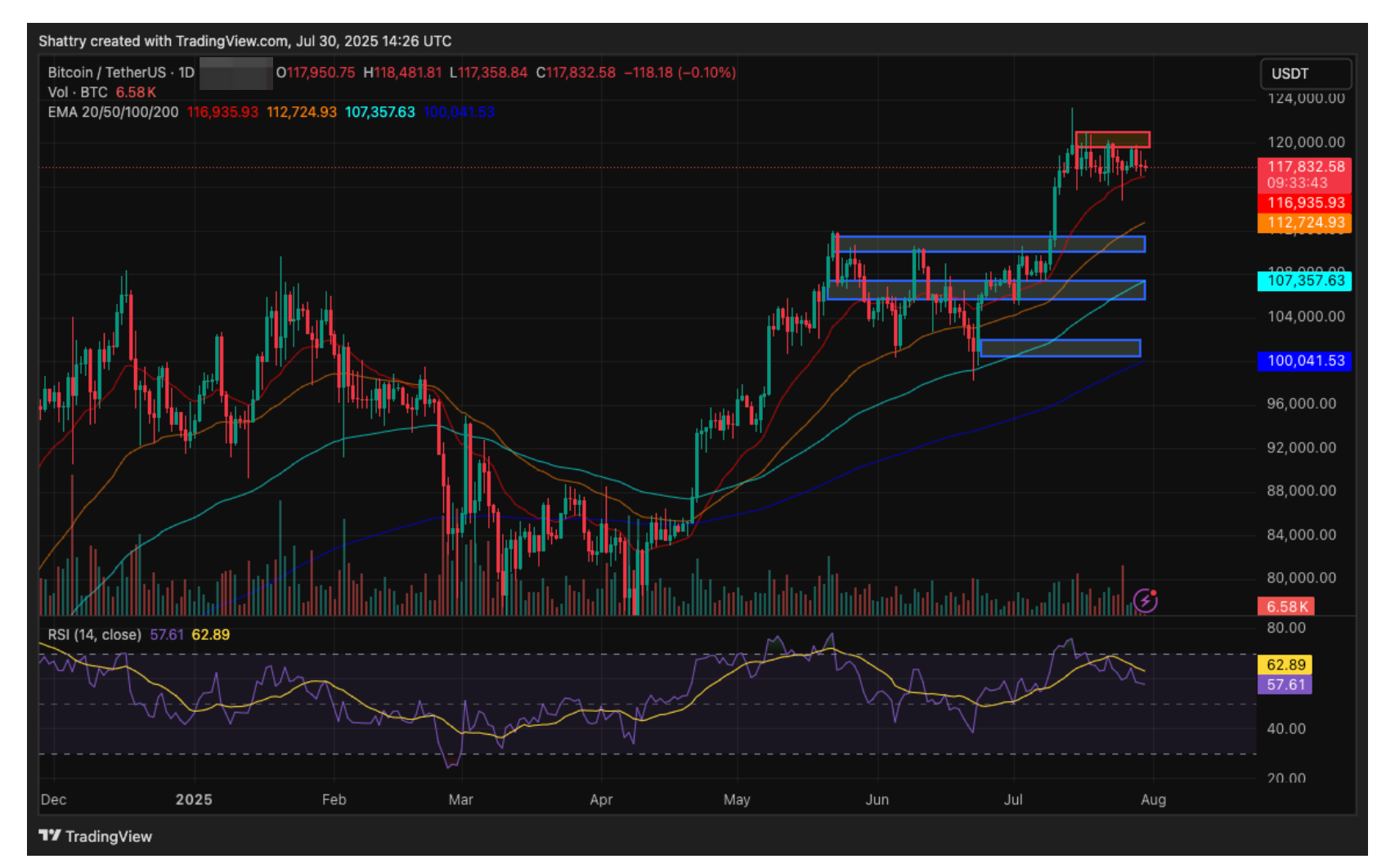 トリガー条件:ブレイク失敗、EMAサポート帯をテスト(20日116,936 → 50日112,725 → 100日107,358ドル)