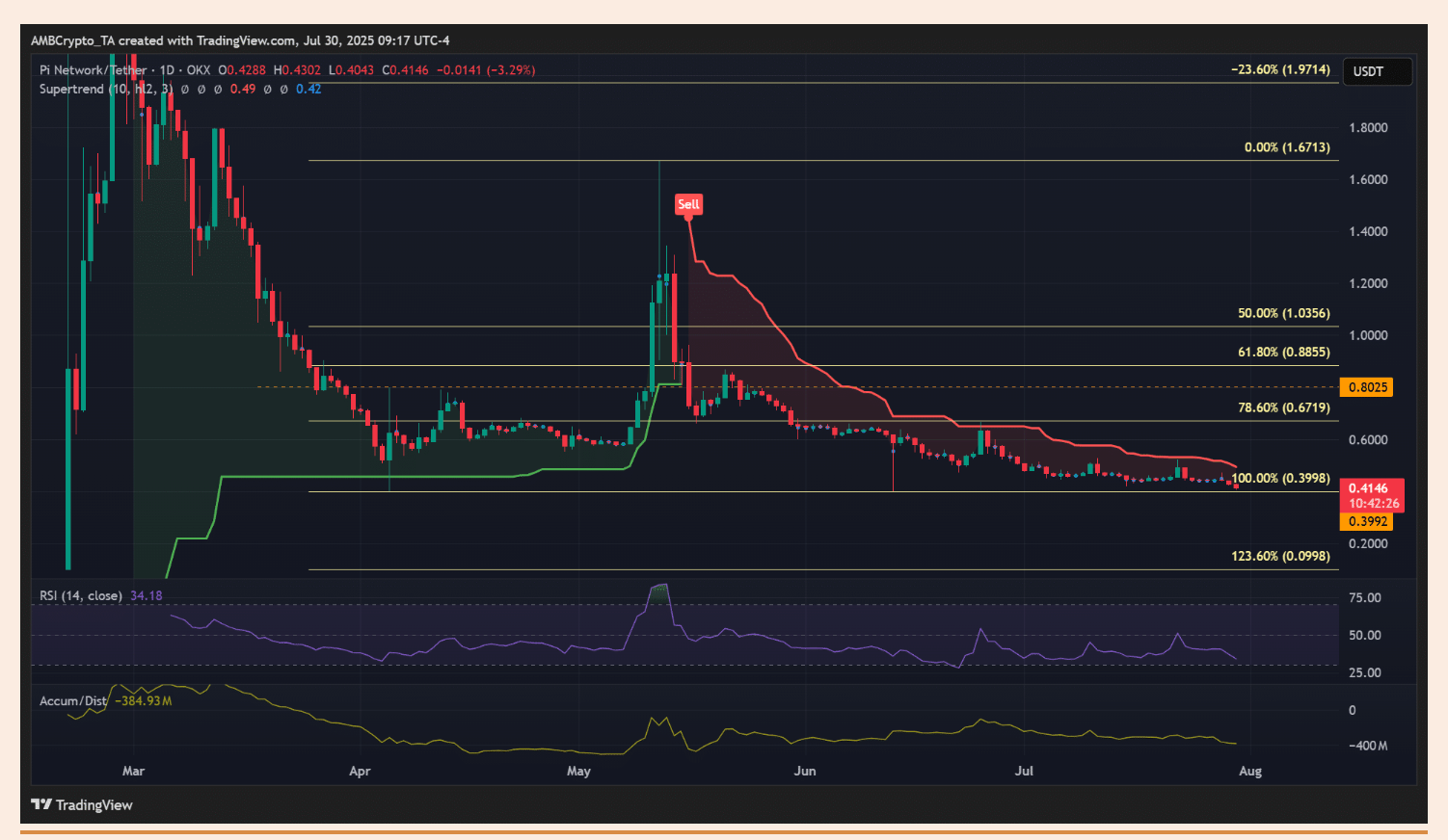 Pi NetworkトークンPIは5月に大きな上昇を記録した後、持続的な利益確定に直面しており、過去2ヶ月で価格は$1.67の高位から大きな下落を遂げ、$0.40の重要なサポートレベルまで75%下落しました。歴史的に、この位置は4月と6月の投げ売り潮をうまく防いだことがあります。現在、日足チャートのRSIは売られ過ぎエリアに近づいており、ショートポジションの勢いが弱まっていることを示唆していますが、SuperTrendは売り信号を維持しており、ソーシャルボリュームの縮小と派生商品への関心の低迷は依然として圧力をかけています。$0.4のサポートを守ることができれば、反転目標は$0.67(60%の上昇)または$1(150%の上昇)を見ることができます;失うと、$0.09までディップする恐れがあります。