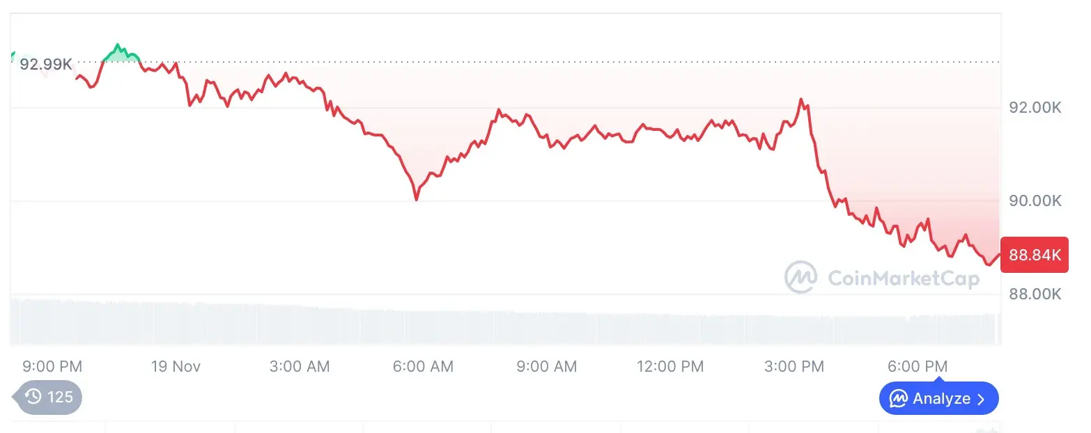 暗号資産市場下落行情分析:ビットコイン下落至88,843ドル、イーサリアム下落至2,882ドル