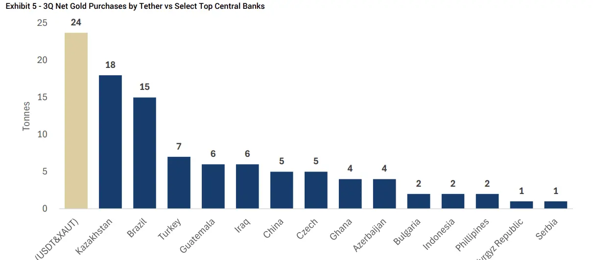 USDTのような米ドル連動型、金連動型のXAUtなどのステーブルコインを発行する暗号資産企業テザーは、投資銀行ジェフリーズのデータによれば、Q3に26トンの金を購入し、同期間におけるいかなる中央銀行よりも多く金を取得しました。