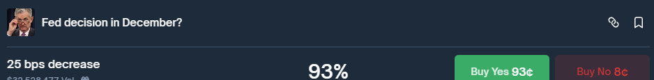 前述の通り、執筆時点でビットコインは$93,000を上回る水準を維持しており、これは主に、今後開催される連邦公開市場委員会((FOMC))の会合で再度利下げが実施されるとの楽観的な見方が後押ししています。実際、暗号資産ベースの予測プラットフォームによれば、トレーダーは93%の確率で利下げが行われると考えています。