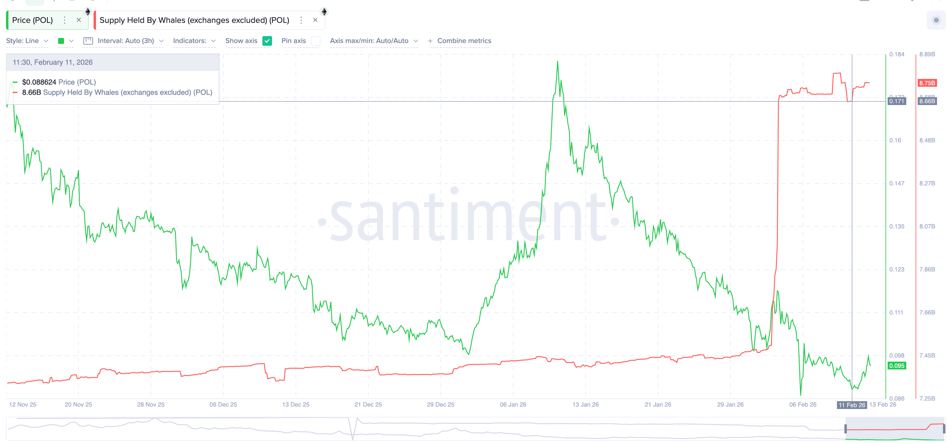 在散户和短线交易员保持警惕的同时,巨鲸地址却展现了截然不同的策略。自 2 月初以来,持有大量 POL 的巨鲸地址持仓量从约 75 亿枚增加至近 87.5 亿枚,增幅约为 16% 。这种悄无声息的积累行为,是 POL 能够多次在 $0.087 美元附近获得支撑并反弹的主要原因。
