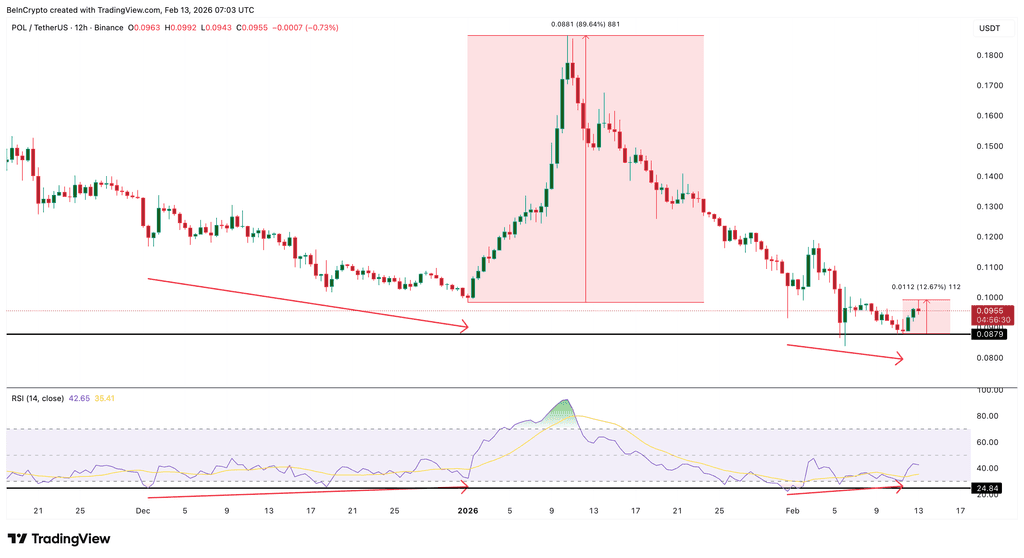 从K线图观察,当前 Polygon 的价格结构与 2026 年 1 月推动价格飙升 90% 之前的底部形态确有相似之处。自 2 月 11 日以来,POL 价格已回升近 13%,并在今日稳定于 0.095 美元至 0.102 美元区间。同时,相对强弱指数(RSI)显示出看涨背离——价格触及新低,而 RSI 的低点却在抬升,这通常预示着抛售动能的减弱 。