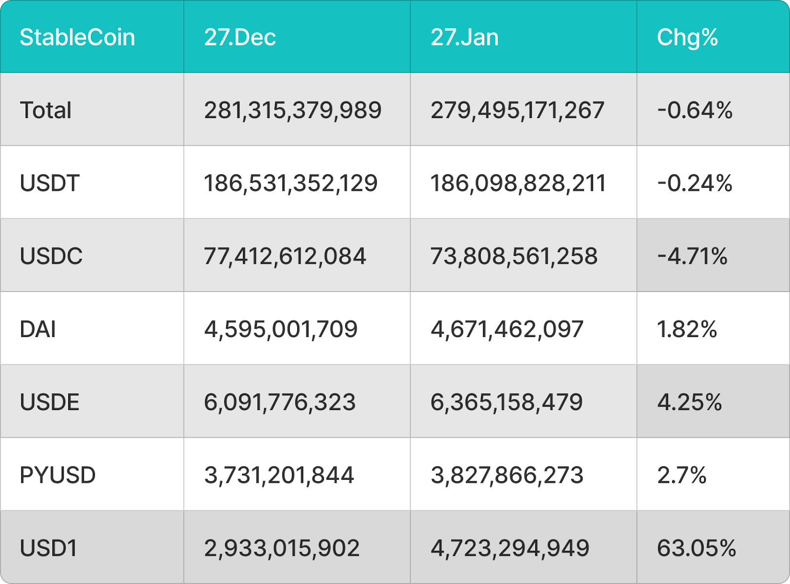 Meanwhile, some non-mainstream or emerging stablecoins grew against the trend. USDE and DAI expanded by 4.25% and 1.82%, respectively, showing renewed demand for certain mechanism-based stablecoins. PYUSD continued modest growth, up 2.7%. Notably, USD1’s circulation surged 63.05%, becoming the fastest-growing stablecoin this month, reflecting structural fund shifts toward new stablecoin products amid stockpile conditions.