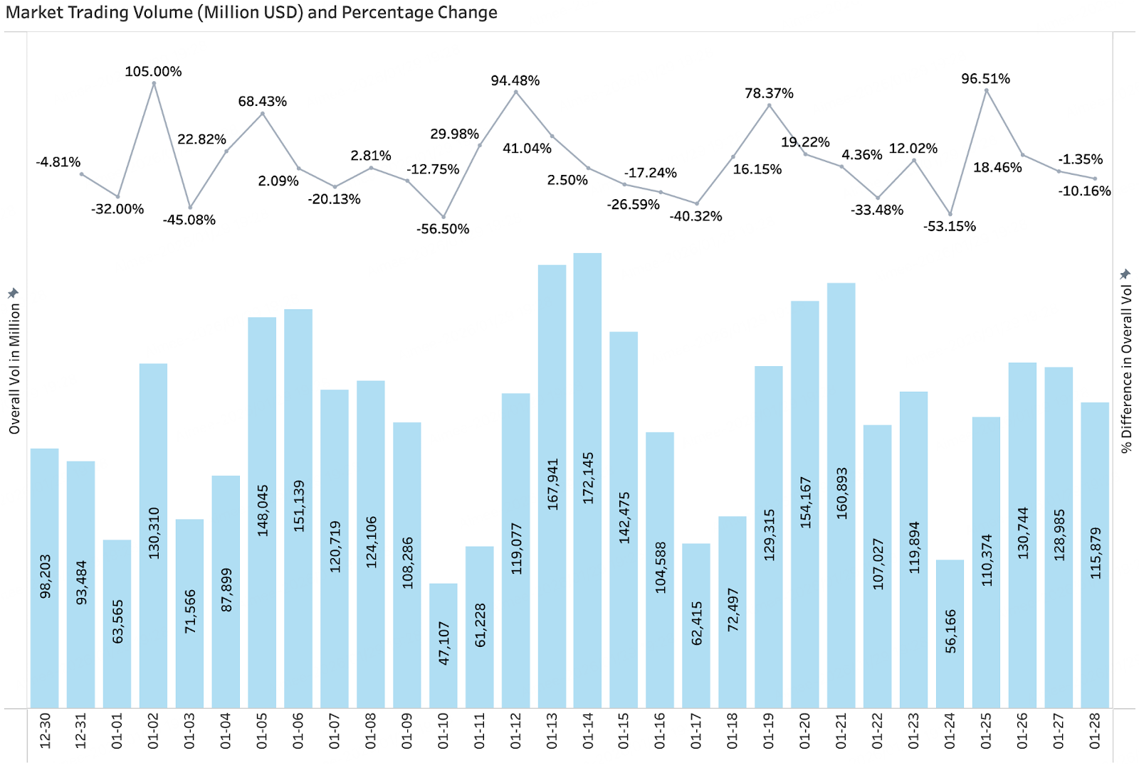 According to CoinGecko, as of January 28, overall crypto market trading volume fluctuated significantly, averaging around $110 billion to $160 billion daily. Multiple volume spikes occurred but lacked sustainability, often quickly reverting, indicating no clear trend formation. Structurally, active trading was driven more by short-term funds and event-driven factors rather than sustained long-term capital inflows. Overall, January’s volume reflects activity recovery but persistent bullish-bearish disagreements, favoring range-bound oscillations.