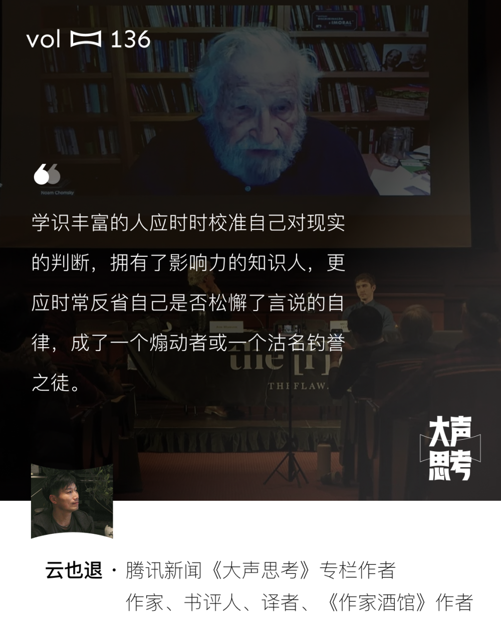Intellectuals should be humble. Knowledgeable people should constantly calibrate their judgments of reality. Influential thinkers should reflect whether they have become lax in self-discipline, turning into agitators or fame-seekers. Noam Chomsky, now 97, isn’t being condemned because of Epstein; he’s been a symbol of shame long before that—his words, his manner of speaking, his endless speeches prefigure the public discourse collapse in the digital age.