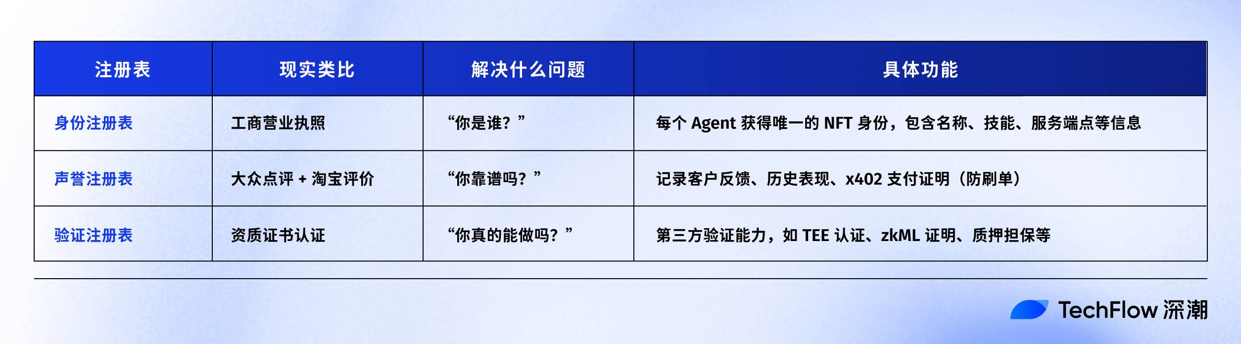 The third is the Verification Register. Allows third-party organizations to endorse the agent, e.g., “This agent passed certain security audits.”