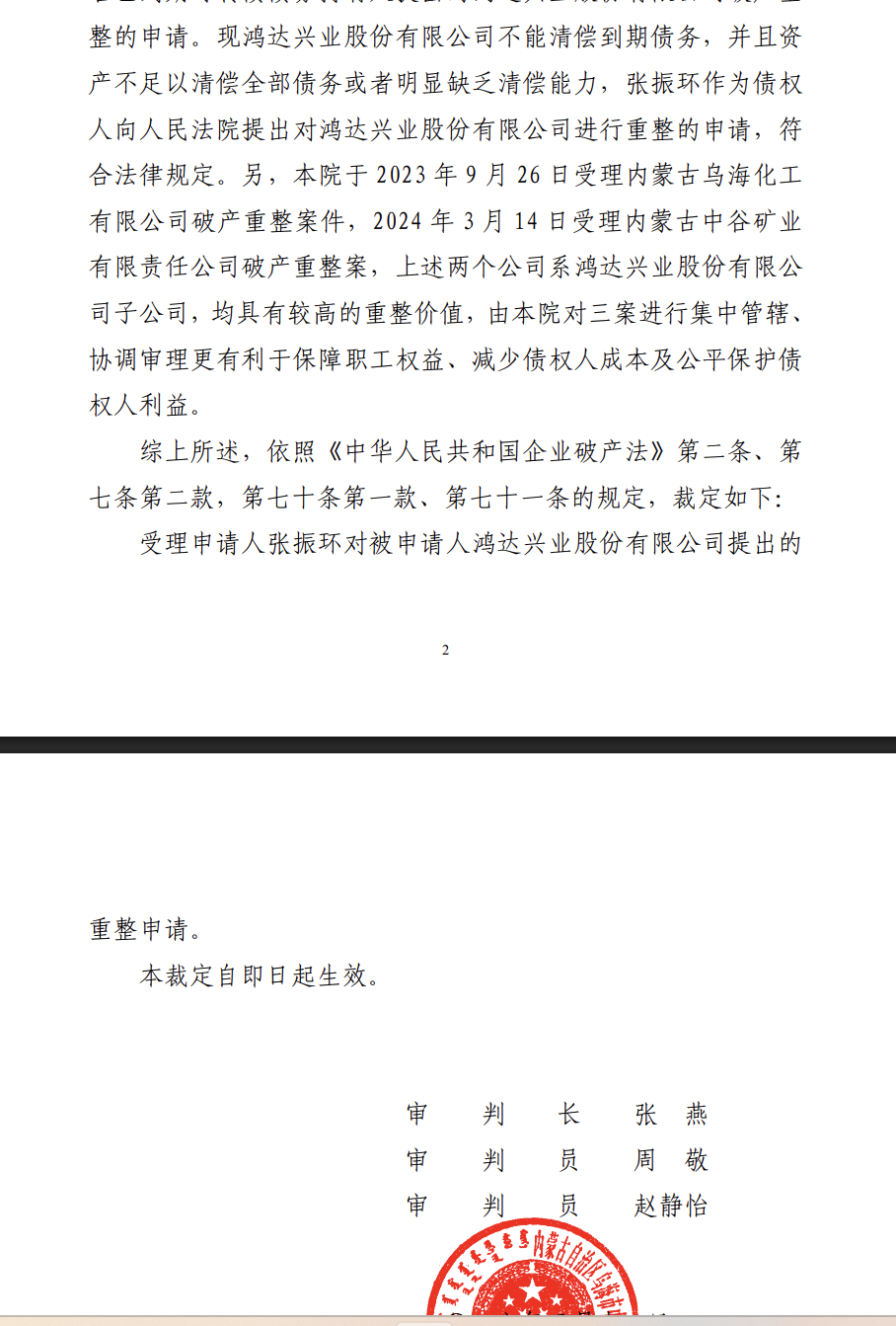 【Cage: Hongda Xingye Co., Ltd.-R Hongda 1 Suspended】Wuhai Intermediate Court Rules to Accept Hongda Xingye Co., Ltd. Bankruptcy Application