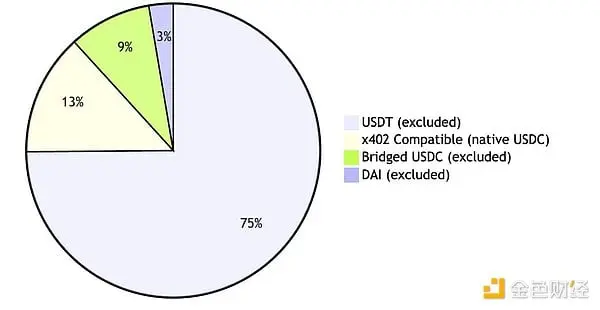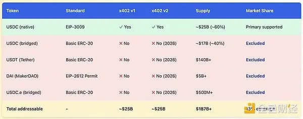 Isto significa que a versão v1 do x402 é compatível com menos de 60% dos tokens principais, incluindo os mais utilizados. Quanto às stablecoins, a situação é ainda mais severa: o USDT, a maior stablecoin com mais de 140 mil milhões de dólares em circulação, nunca suportou o padrão EIP-3009 e não tem planos de o fazer. A DAI usa o padrão de licença EIP-2612, semelhante, mas com interfaces incompatíveis, impedindo a compatibilidade ao nível do protocolo.