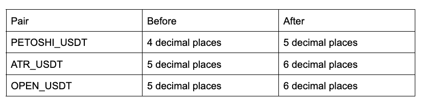 O ajuste do tamanho do tick não afetará as ordens de negociação à vista existentes. Após o novo tamanho do tick entrar em vigor, as ordens colocadas antes da mudança do tamanho do tick ainda serão correspondidas com o tamanho do tick original.