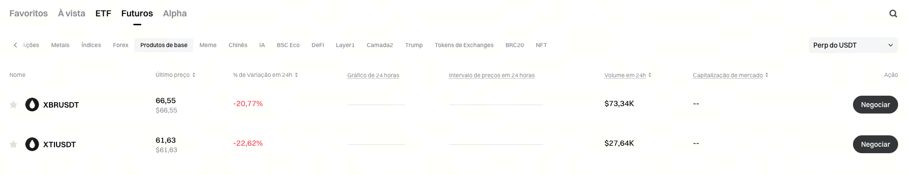 Lançamento dos novos contratos de futuros XTI e XBR, com suporte para alavancagem até 100x. Os utilizadores podem aceder à página do Mercado de Futuros e selecionar a categoria Matérias-Primas para consultar os pares de negociação disponíveis.
