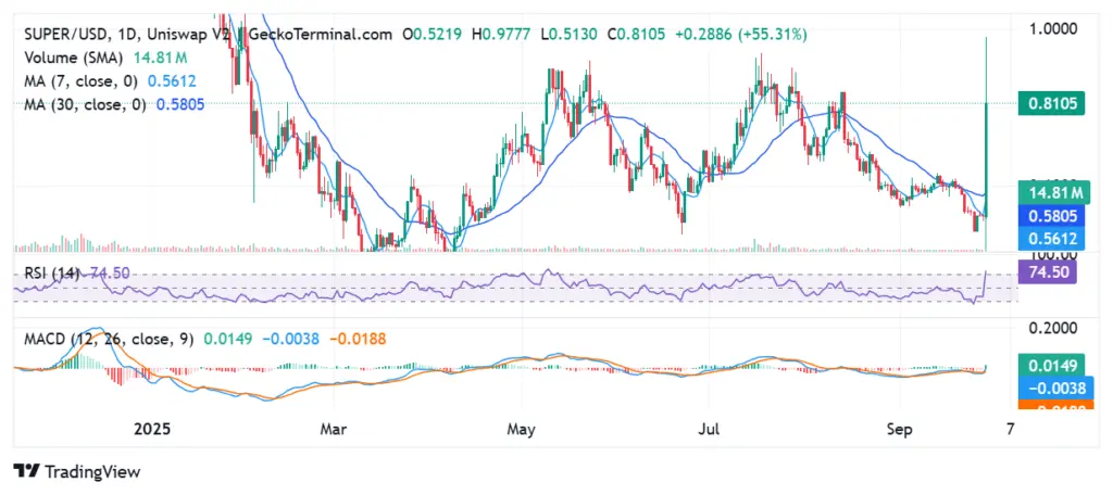 SuperVerse (SUPER) preço dispara 61% acima de $0.9, risco de pullback emerge