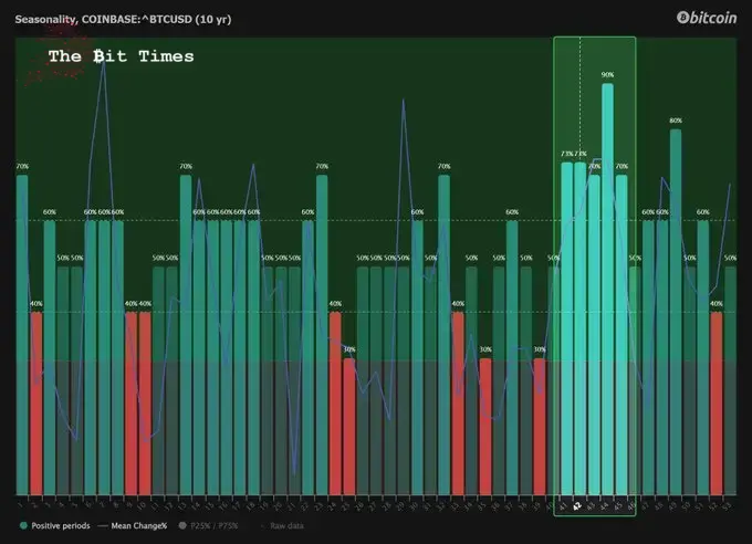 Uma Análise de sazonalidade de 10 anos indica que o Bitcoin registou ganhos em até 90% das instâncias durante este período, de acordo com as informações partilhadas pela plataforma de gráficos TrendSpider.