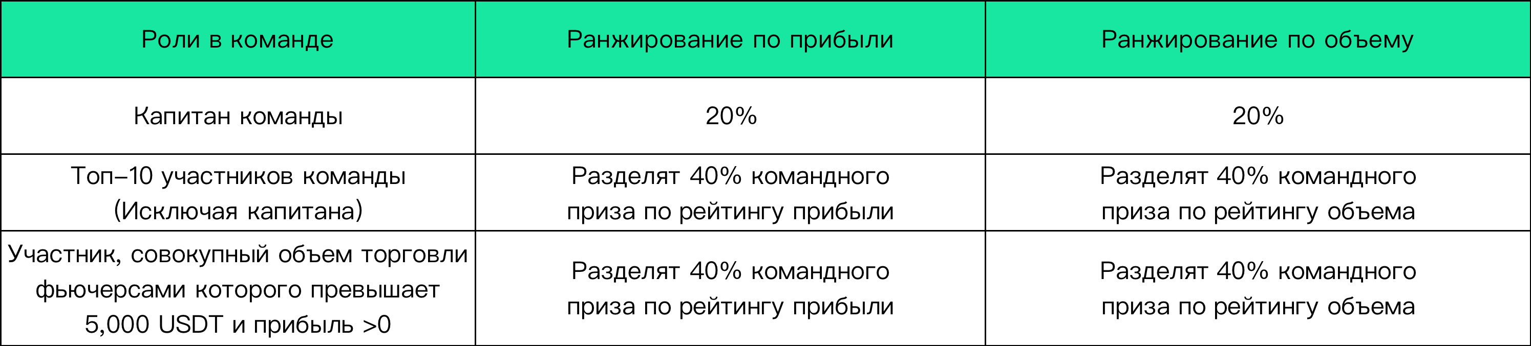 1.Командная прибыль = сумма всей прибыли внутри команды. Пользователи, чья прибыль < 0 или совокупный объем торгов < 5,000 USDT во время соревнования, не будут допущены к участию в рейтинге.