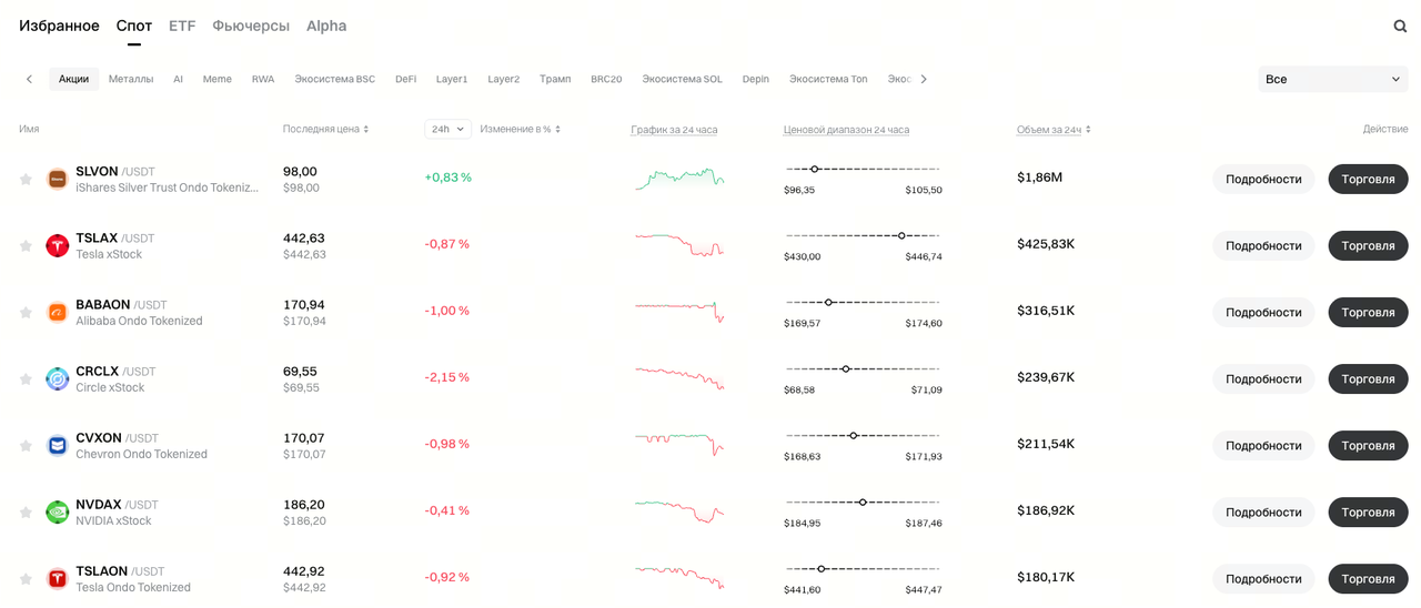 Раздел акций на Gate поддерживается проектами xStocks и Ondo, предлагая как спотовую торговлю, так и бессрочные контракты с расчетом в USDT. В этом разделе используется легальная модель токенизации реальных активов.