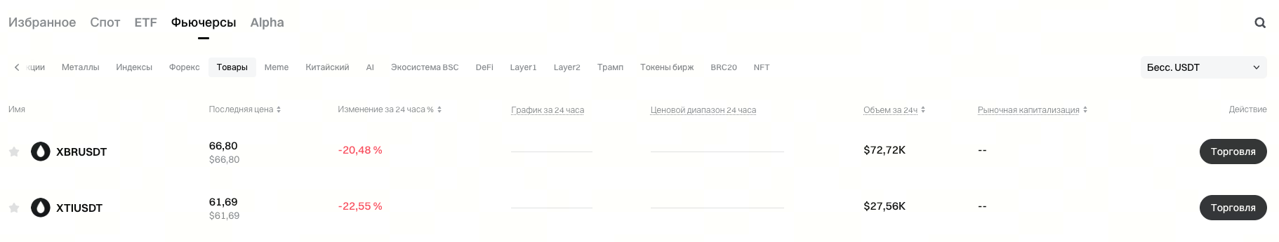 Запущены новые фьючерсные контракты XTI и XBR с поддержкой плеча до 100x. Пользователи могут перейти на страницу Рынка Фьючерсов и выбрать категорию Товары для просмотра доступных торговых пар.