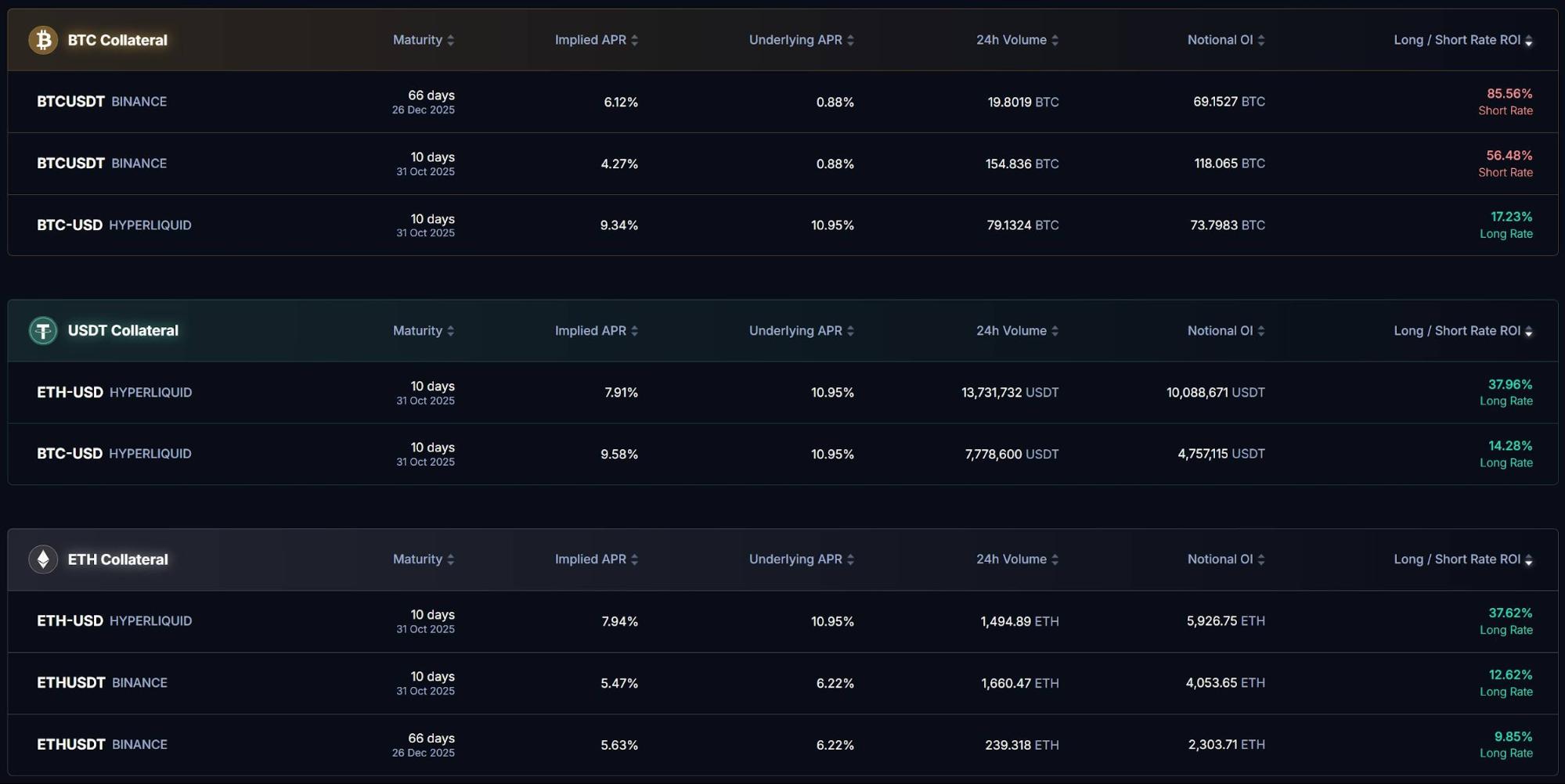 Boros также предлагает продукты с разными сроками погашения, что позволяет арбитраж между сроками: если предполагаемая годовая процентная ставка (Implied APR) для краткосрочного YU ниже, чем для долгосрочного, значит, краткосрочные ставки ожидаются ниже долгосрочных. Покупайте краткосрочный YU, продавайте долгосрочный — или наоборот.