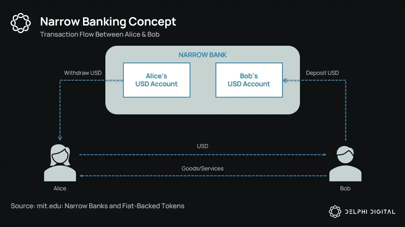 Стейблкоины, обеспеченные фиатом, фактически реализовали модель «narrow banking»: выпускают цифровые обязательства, погашаемые в долларах, и обеспечивают их 1:1 надёжными ликвидными резервами вне цепи. Как и «narrow banks», эмитенты стейблкоинов не используют резервы для кредитования. Хотя такие эмитенты, как Tether, сейчас не выплачивают проценты, это выходит за рамки статьи — здесь рассматривается роль стейблкоинов в современной монетарной архитектуре.