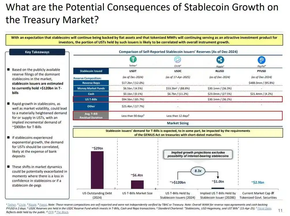 Эмитенты стейблкоинов — долгосрочные чистые покупатели краткосрочных казначейских бумаг США. Каждый доллар стейблкоина обеспечен эквивалентными активами на балансе — обычно казначейскими векселями или операциями обратного репо. В отличие от банков, эмитенты не продают эти облигации для кредитования или перехода к более рискованным инструментам.