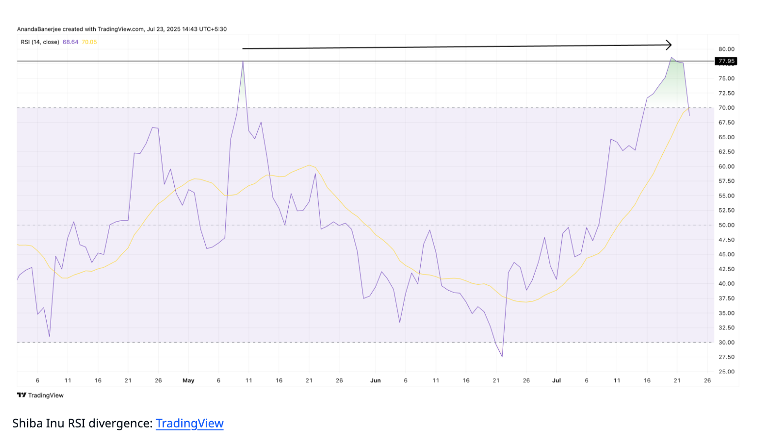 RSI измеряет силу недавних изменений цен в диапазоне от 0 до 100. С середины июня дневной RSI показал небольшую восходящую тенденцию, в то время как цена не смогла突破 предыдущий максимум, сформировав бычью дивергенцию. Хотя эта дивергенция незначительна, она указывает на то, что восходящая динамика усиливается, что является позитивным сигналом для ценового движения Shiba Inu.