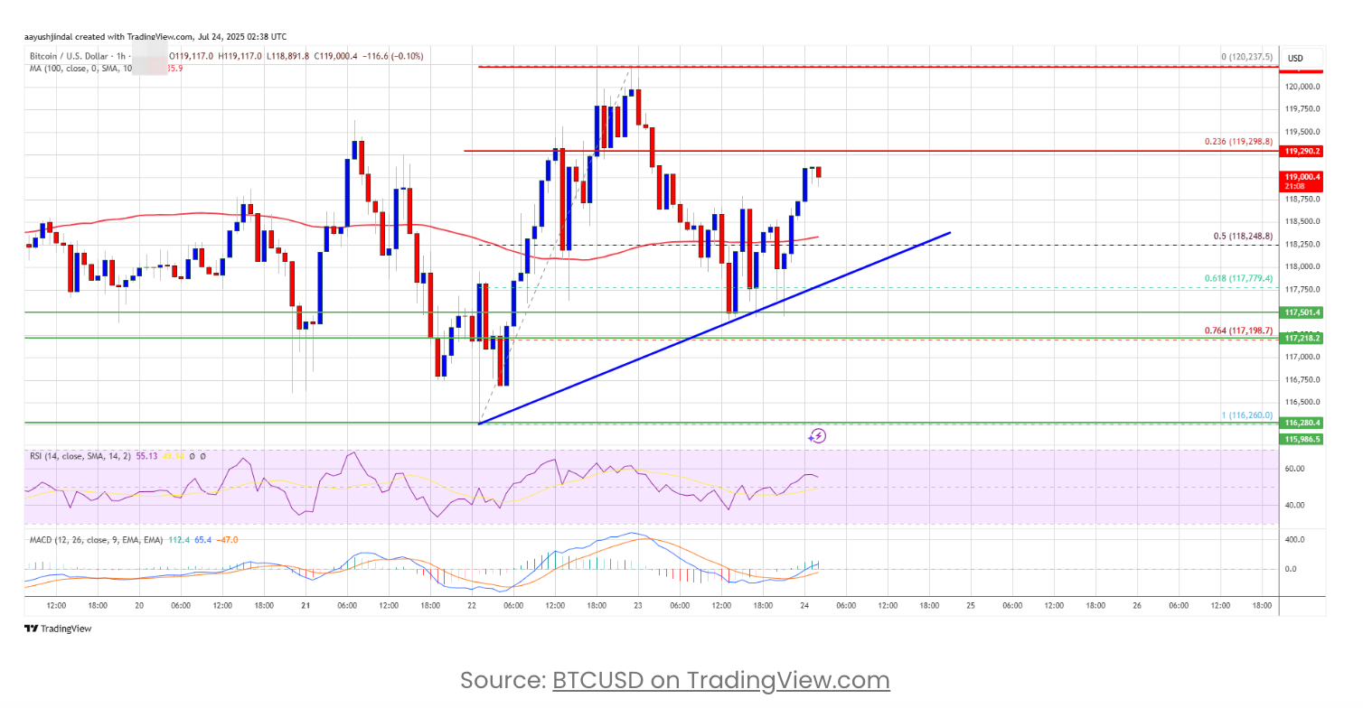 Цена Биткойна пытается пробить уровень сопротивления $118,500 и преодолеть ключевую зону сопротивления $120,250 для получения краткосрочной бычьей динамики. Если эти ключевые уровни будут пробиты, BTC может ожидать дальнейший рост.