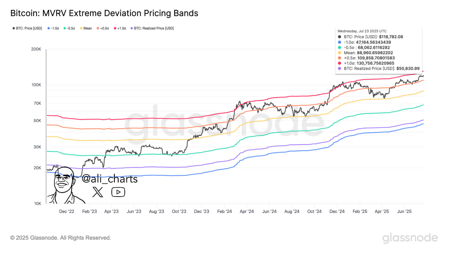 По состоянию на 23 июля цена Биткойна достигла примерно $118,782 и близка к ценовому диапазону +1.0σ в модели MVRV ($130,756), который обычно рассматривается как зона чрезмерного оптимизма на рынке и может стать следующей целью сопротивления.