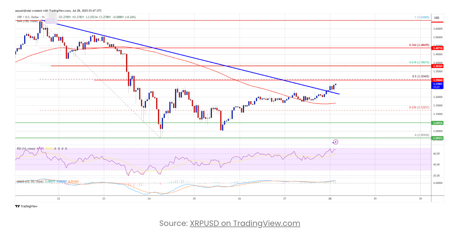 Цена Ripple XRP, после коррекции, успешно начала новый ралли из области поддержки 2.950 USD. В настоящее время цена XRP стабилизировалась выше 3.20 USD и демонстрирует потенциал для дальнейшего роста. Особенно важно, что цена успешно преодолела уровень 3.220 USD и 100-часовую простую скользящую среднюю (SMA), что добавляет положительный сигнал к краткосрочной тенденции.