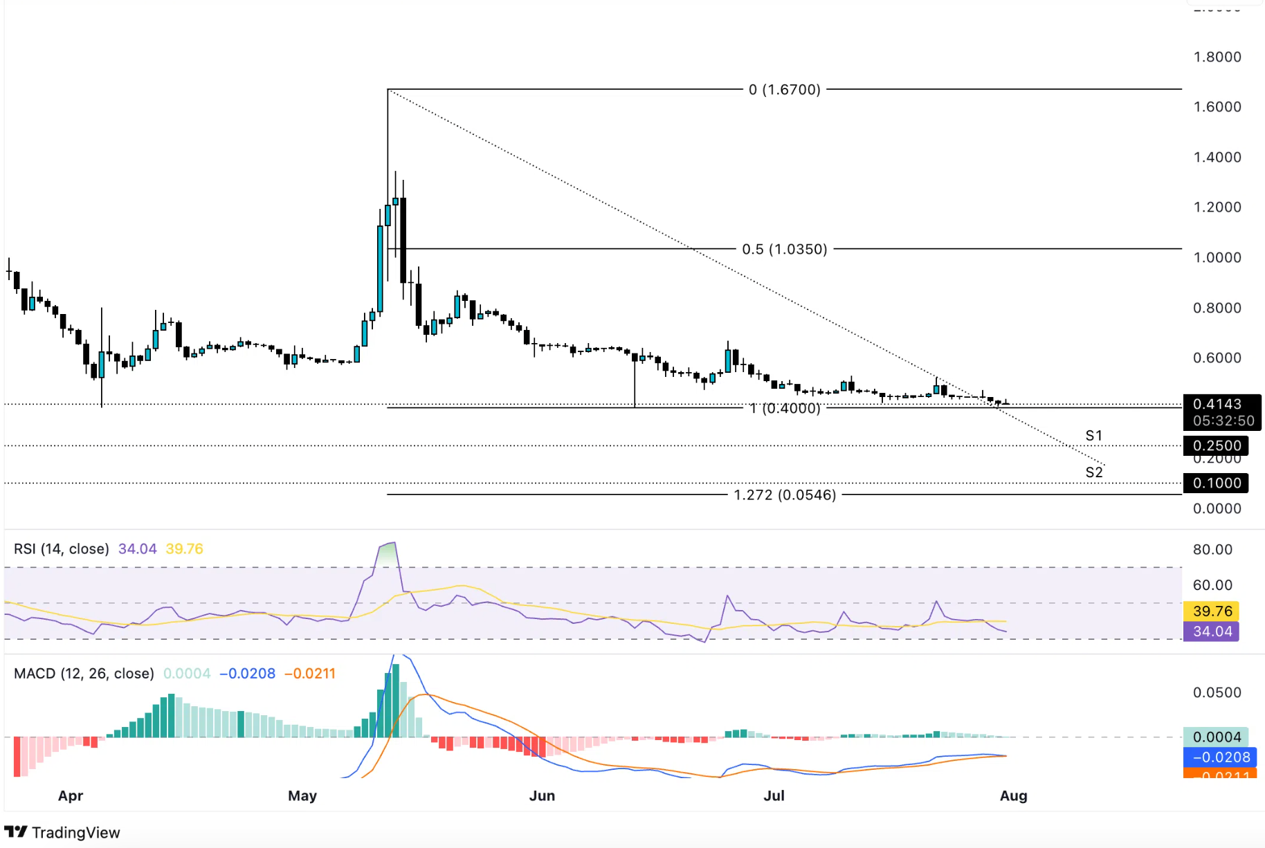 Ключевой уровень поддержки 0.4000 долларов стал точкой схватки между быками и медведями, и если он будет пробит, это может вызвать событие ликвидного краха. Технические индикаторы дают сильный медвежий сигнал: