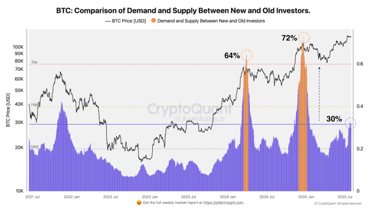 Биткойн накапливает силу на уровне 120000 долларов: доля новых инвесторов составляет 30%, что не достигает порога перегрева, данные в блокчейне указывают на то, что Бычий рынок все еще имеет пространство.