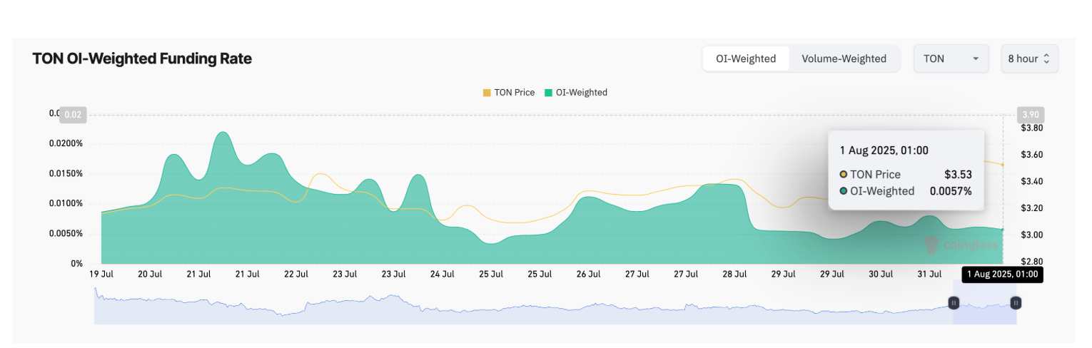 Положительная ставка финансирования TON означает: Быки готовы платить премию за удержание длинных позиций, что явно указывает на преобладающее бычье настроение среди участников фьючерсного рынка, предполагая, что больше инвесторов ожидают роста цены TON в краткосрочной перспективе.