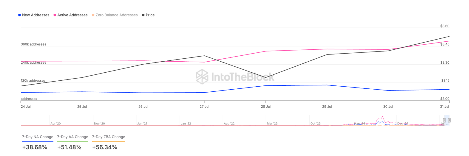 Новый спрос увеличился на 38%: Согласно данным IntoTheBlock, за последние 7 дней новый спрос на TON резко возрос на 38%. Показатель нового спроса обычно отражает приток нового капитала (Fresh Capital), который приносят новые пользователи или инвесторы в экосистему, и является сильной поддержкой текущей восходящей тенденции.